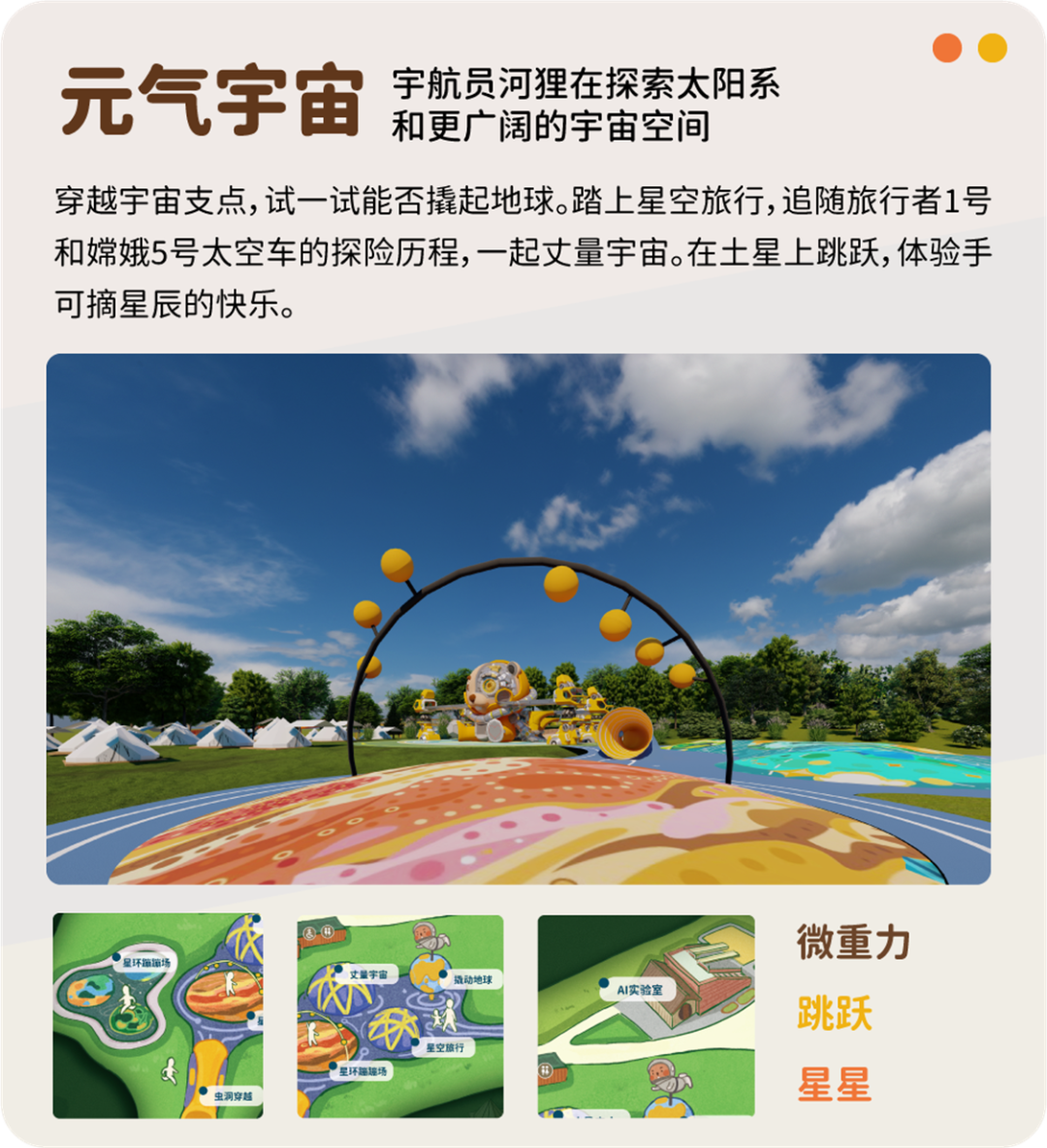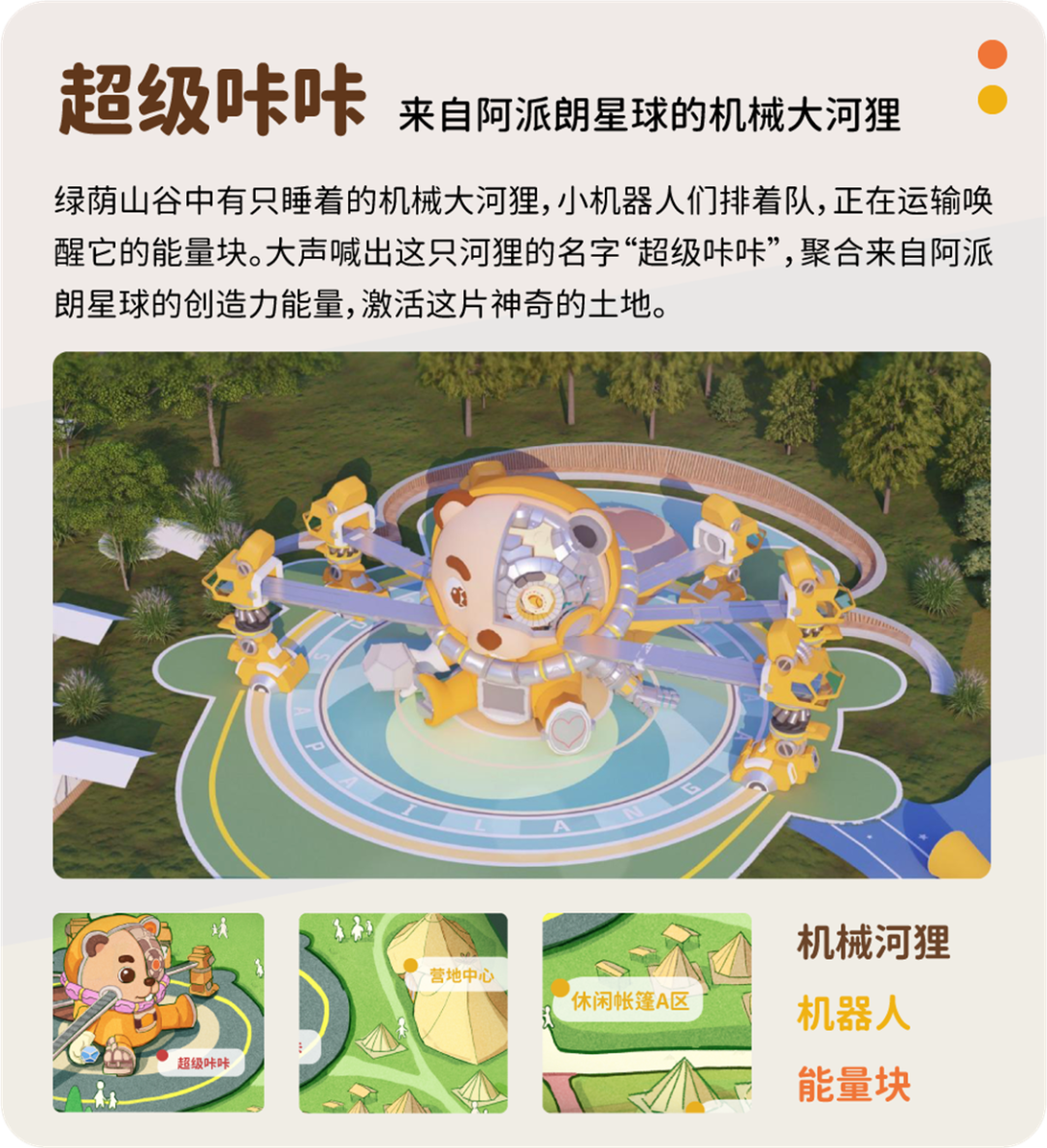 創造登陸站、超級咔咔、未來牧場、密碼天才灣、律動森林、元氣宇宙、派派營地、咔咔美味村8大主題板塊通玩