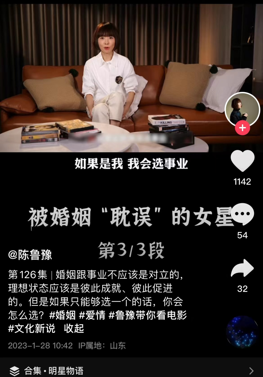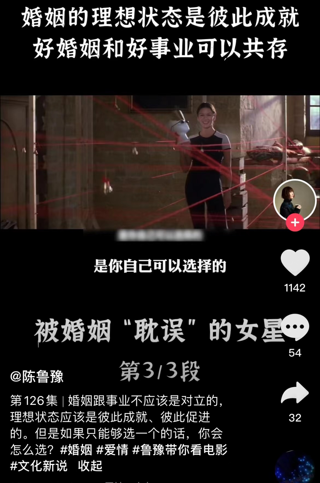 前幾天在抖音上看到主持人魯豫,她講了幾期被婚姻耽誤事業的好萊塢女星,節目收尾處她語重心長地表示,好婚姻和好事業可以並存,但是很稀缺的奢侈。