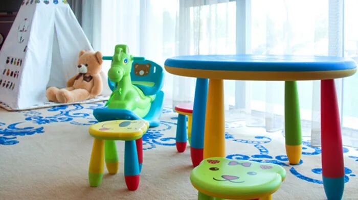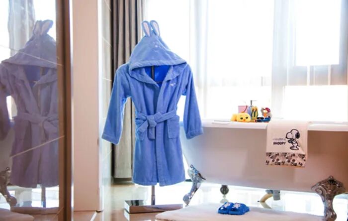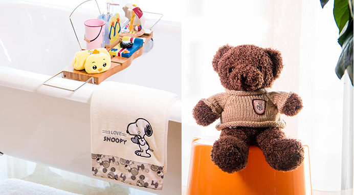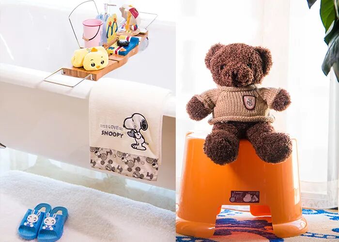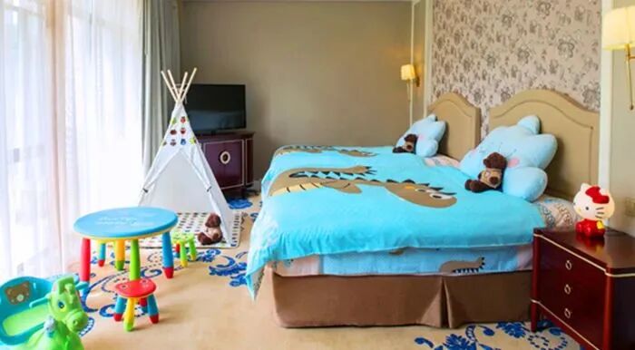 親子房佈置:房間內含兒童小帳篷一頂,兒童桌椅,兒童搖搖木馬,兒童小夜燈,卡通床品(床單、被罩、抱枕)一套,兒童浴袍、拖鞋、毛巾、手巾,兒童衛浴五金件(皂盒、牙刷架、洗浴液瓶、漱口杯)一套,曼曼熊一隻。