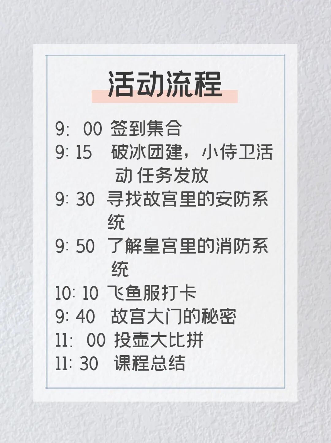 根據低齡兒童學習特點,以及體力,我們這個活動只安排了半天。活動結束後,家長可以帶著孩子繼續在故宮遊覽或自由活動。活動分為上午場和下午場,可以自由選擇上/下午場。