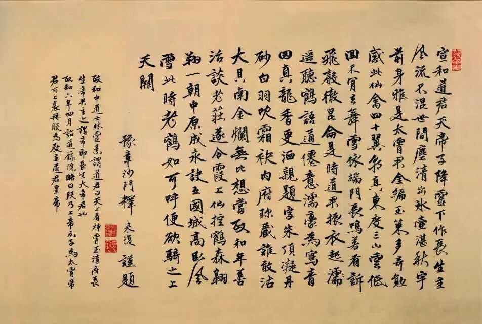 除了宋徽宗獨具特色的瘦金體題字,該作還來複卷尾題寫的這段長跋,一首古體長詩,筆法清秀而峻挺所以在鑑賞和估價這幅作品作時,後面的題詩起到的加持和昇華也一定不可忽略。