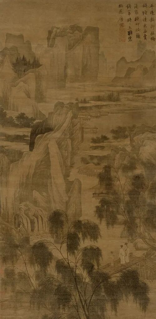 在《柳橋賞春圖》中,唐寅筆下的故事感更為鮮明。兩人橋上雙手相握,“平堤新柳板橋斜,路繞東西賣酒家。拼卻杖頭錢一串,時時來醉碧桃花。”如是,畫上自題詩為我們講述了這情景故事。