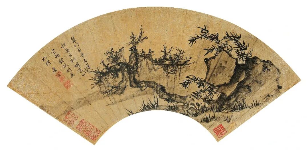 唐寅《枯木竹石圖》,水墨金本、扇面,17×49cm,明代