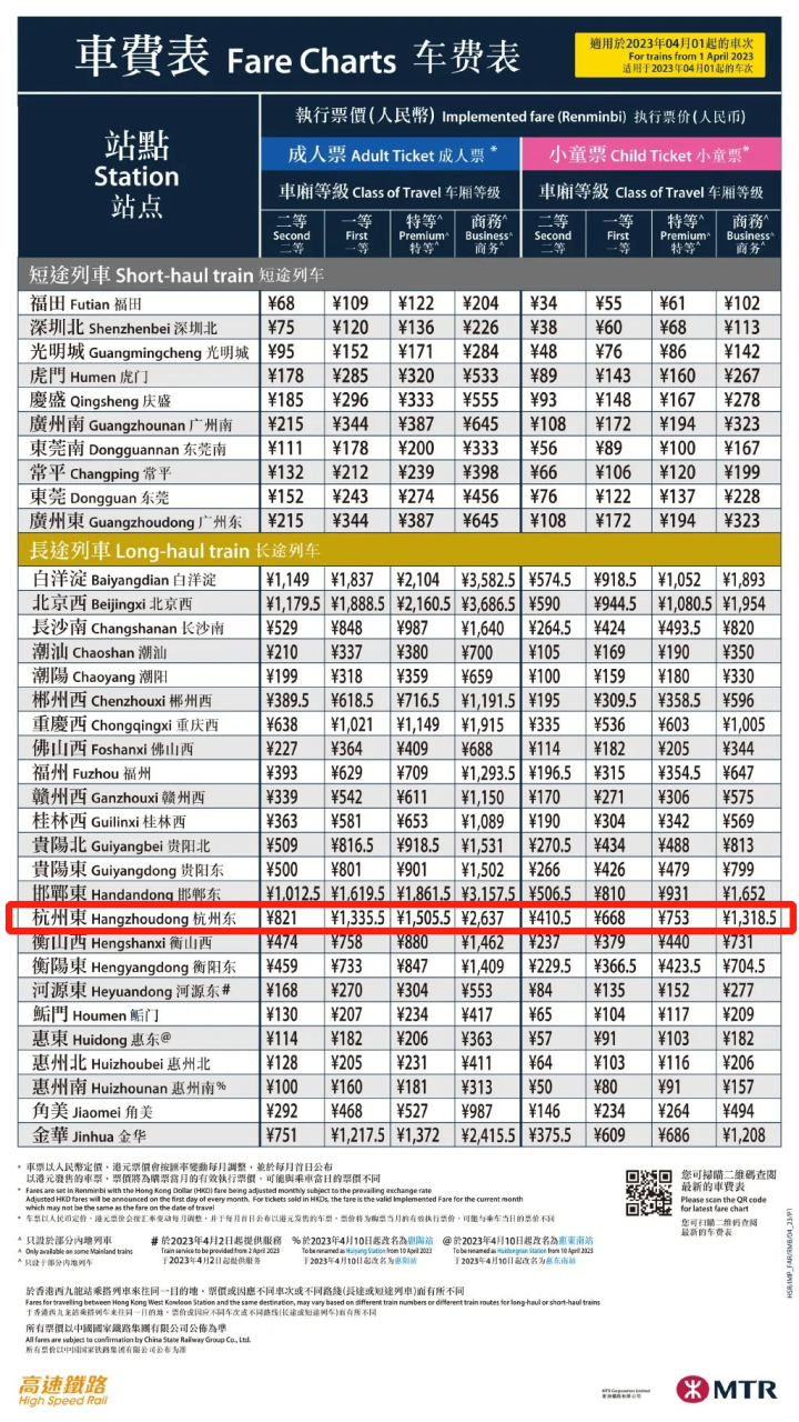那麼,從杭州坐高鐵去香港的價格是多少呢?據港鐵發佈的車費表顯示,從杭州東出發,成人二等車廂為821元,特等車廂為2637元;兒童二等車廂為410.5元,特等車廂為1318.5元。