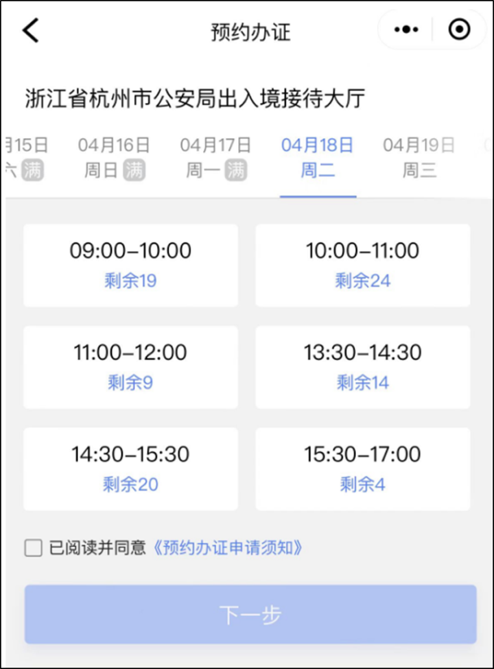橙柿查詢發現,浙江省杭州市公安局出入境接待大廳的預約辦證業務4月上旬都已被約滿,最早只能預約4月18日。