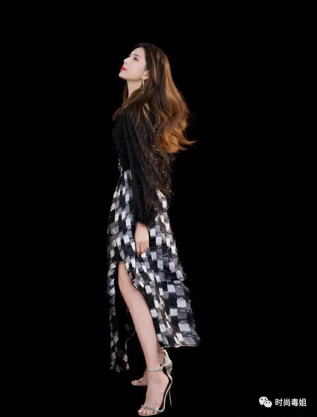 上身穿著黑色的長袖搭配高腰格紋半身裙,顯得時髦個性又帥氣。黑色的長袖衫添加了別緻的流蘇元素進行點綴,增加了幾分少女的活力,顯得不過於沉悶單調。寬鬆的袖子設計能夠較好地遮蓋住手臂的贅肉。下身的黑白格紋半身裙時髦又顯瘦,同時也充滿著十足的文藝氣息,側邊進行開叉設計,若隱若現露出一雙白皙修長的美腿,性感撩人。腳上搭配銀色的高跟鞋,提升氣質,同時也能拉長腿部比例,顯得美麗又帥氣。