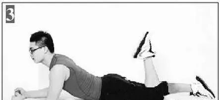 單腿上踢俯臥於墊子上。肘關節彎曲90度,肩部下沉。