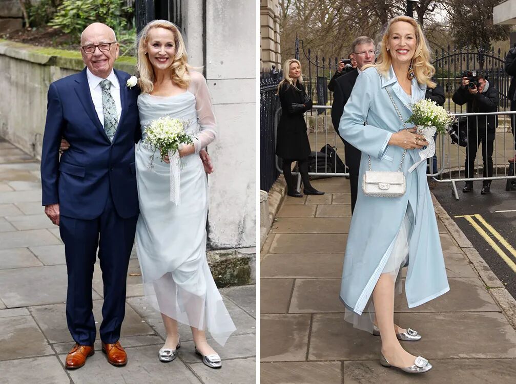 和默多克結婚時,她的Vivienne Westwood藍色連衣裙也很美。既有婚紗的隆重,廓形也很輕鬆隨意,搭配同色系長外套,以及Roger Vivier平底鞋、Chanel包包,非常搶鏡。