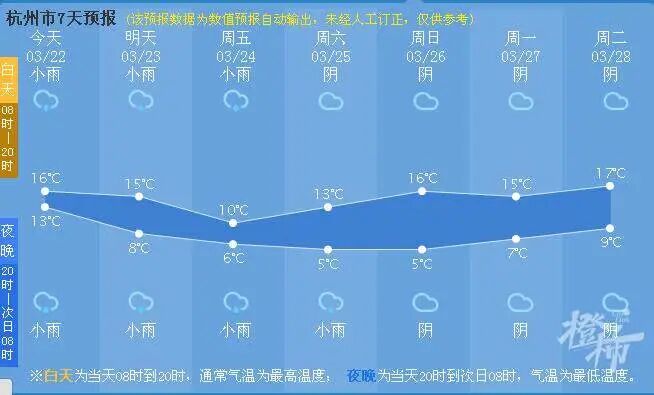 杭州市氣象臺預報,我市今天白天陰有中陣雨或雷雨,夜裡到明天陰有陣雨;後天白天陰有時有小雨,夜裡雨止轉陰天。今天偏北風2-3級。明天白天最高氣溫16℃,明天早晨最低氣溫13℃,今天平均相對溼度90%。