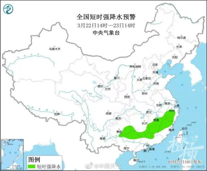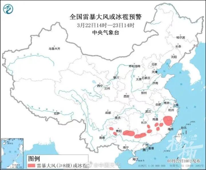 中央氣象臺預計,3月22日14時至23日14時,湖南南部、江西中南部、浙江南部、福建北部和西部、貴州西部和南部、廣西北部及廣東北部等地的部分地區將有8-10級雷暴大風或冰雹天氣;浙江中南部、湖南南部、江西、福建北部和西部、貴州東南部、廣西北部、廣東北部等地的部分地區將有短時強降水,小時雨量20-50毫米,局地可達60毫米以上。預計,強對流的主要影響時段為午後至夜間。