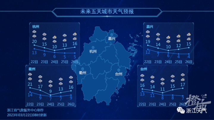 後天溫臺麗地區部分中到大陣雨或雷雨,局部有短時暴雨;浙北北部陰天,其它地區陰有陣雨。