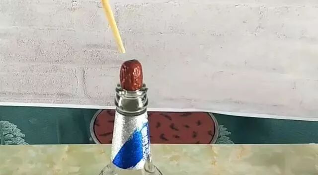 怎麼樣,紅棗核自動的就會跑出去了。接著我們再來試一個看一下效果。將紅棗放在瓶口上面,拿出筷子從中間給他穿過去。怎麼樣有了這個小妙招以後我們一分鐘就能播一大碗紅棗了,非常的實用,希望能夠幫助到大家。