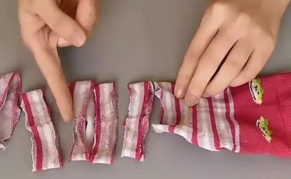 第一步:首先準備一個廢舊的襪子,用剪刀裁剪成寬約1CM左右的細長條,我們先取中間的這四根長途就可以了。