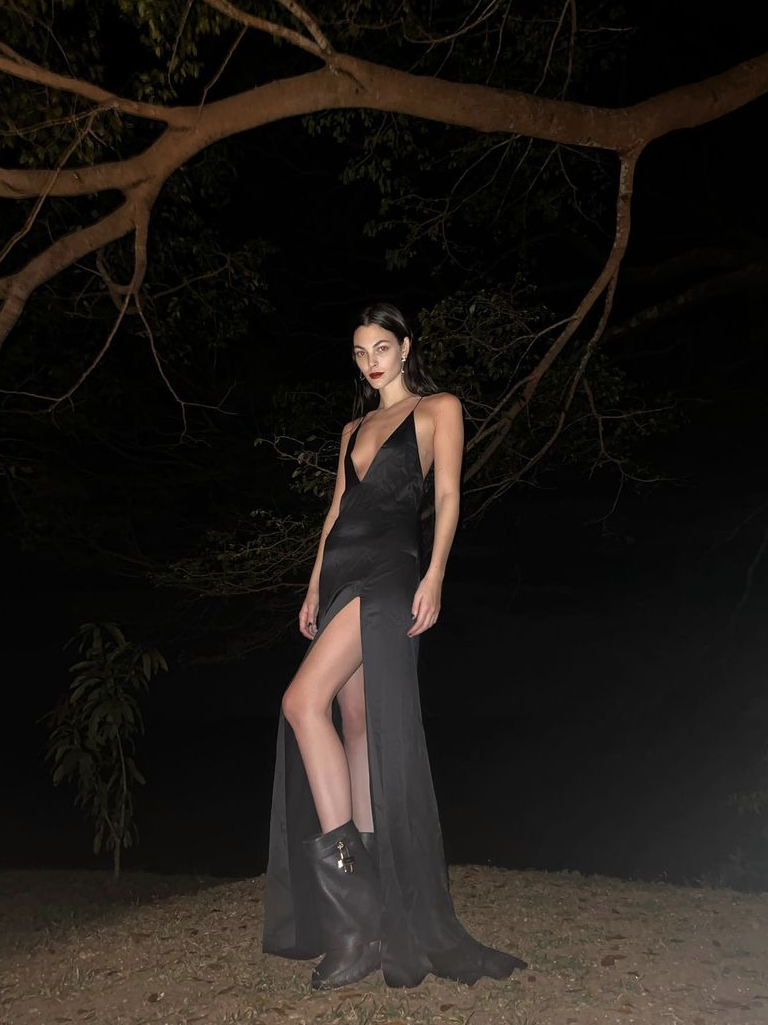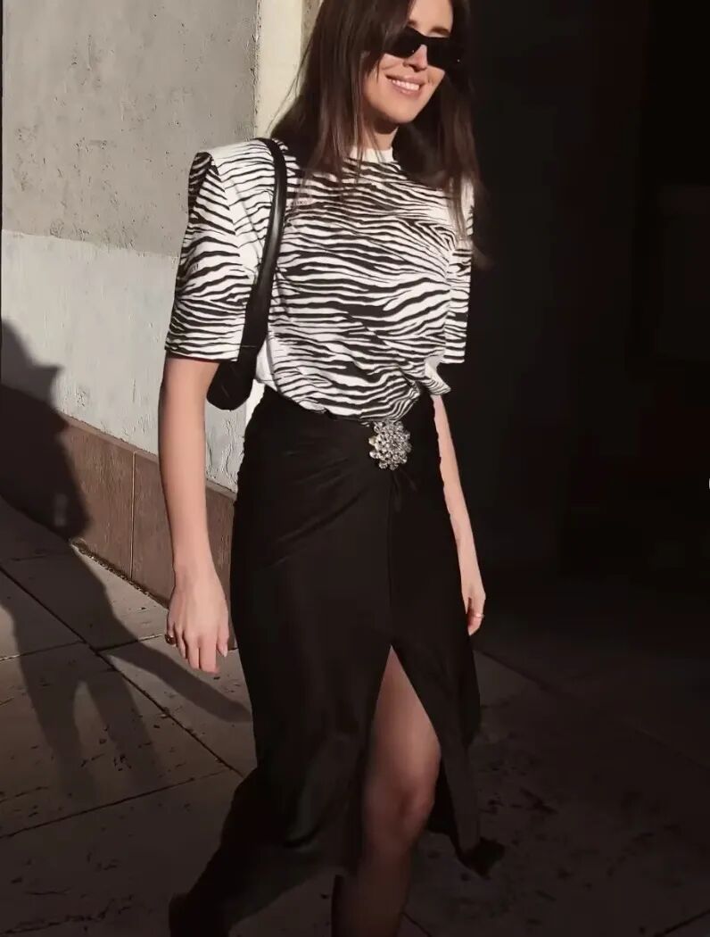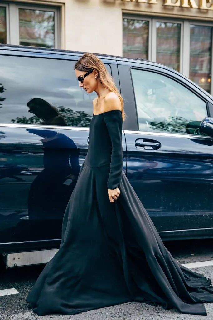 像意大利博主Giorgia Tordin這條黑色長裙,露的就很剋制,避開了胸部和大腿,只露出了肩線和手臂,反而比直白地裸露更高明。