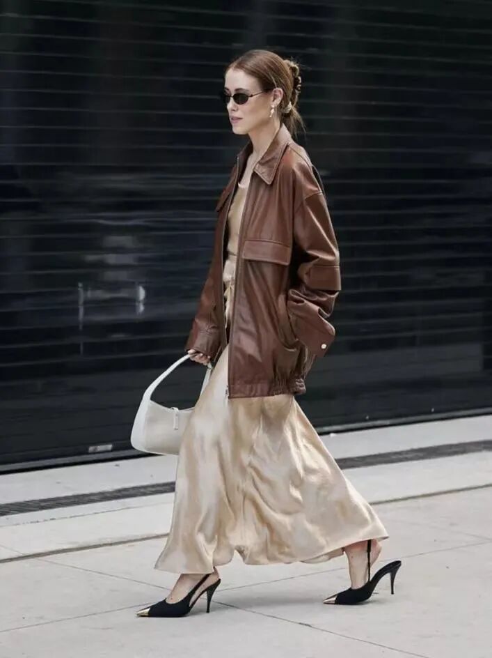 明明也是很有設計感的絲質長裙,瑞典博主Tine Andrea會套上再日常不過的牛仔外套讓它不那麼華麗。