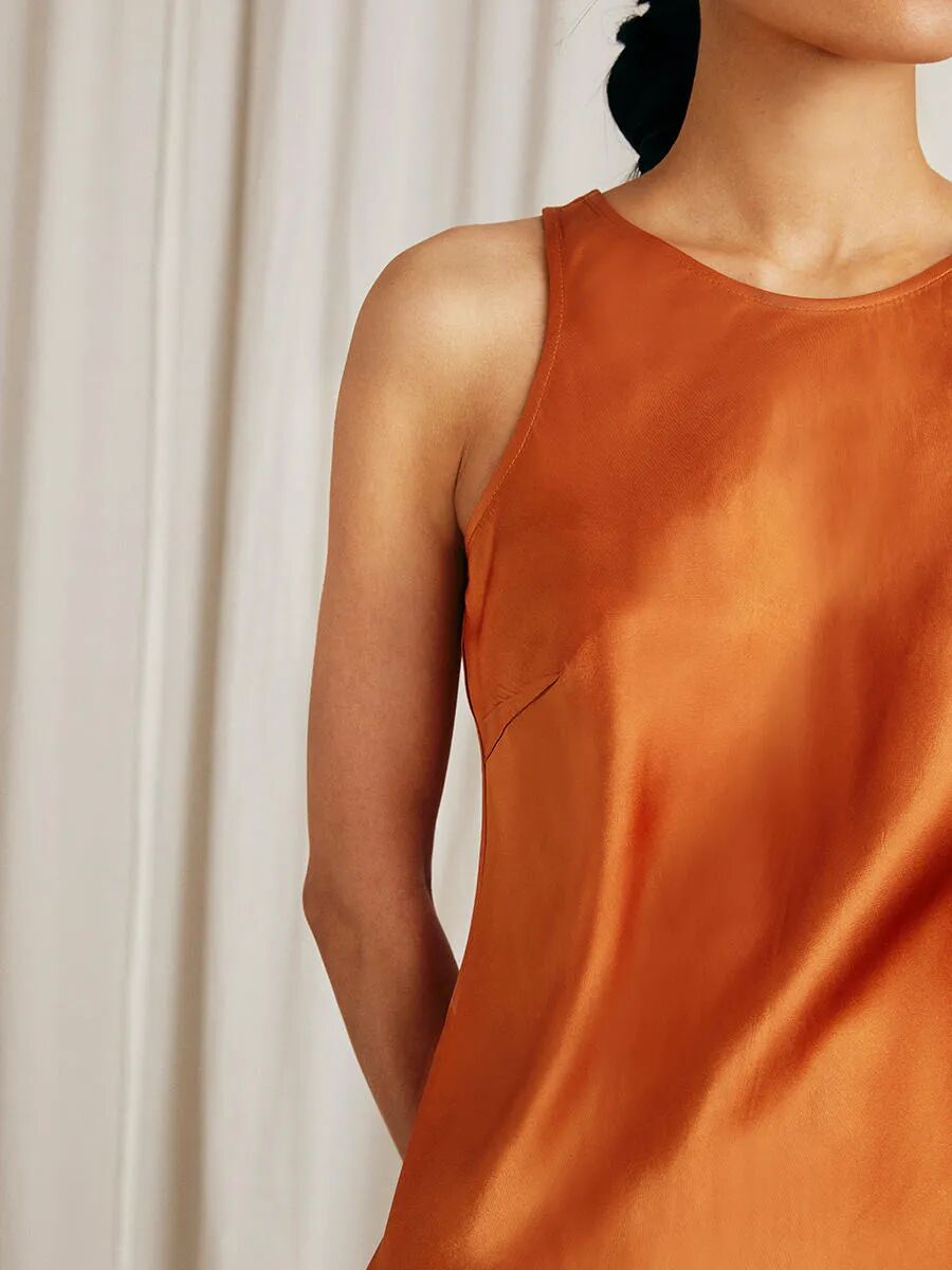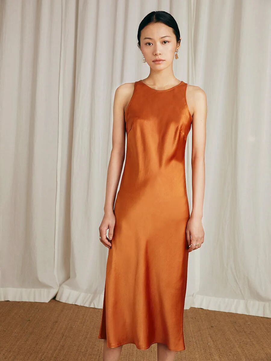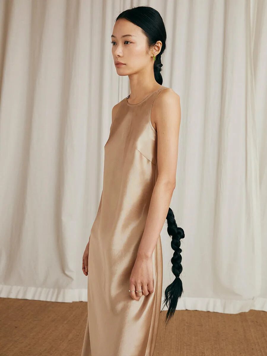 醋酸面料用斜裁的方式設計,裙型自然下垂,版型契合人體曲線,手臂肩線能被修飾到,對身材的包容度很高,可以放心一試!