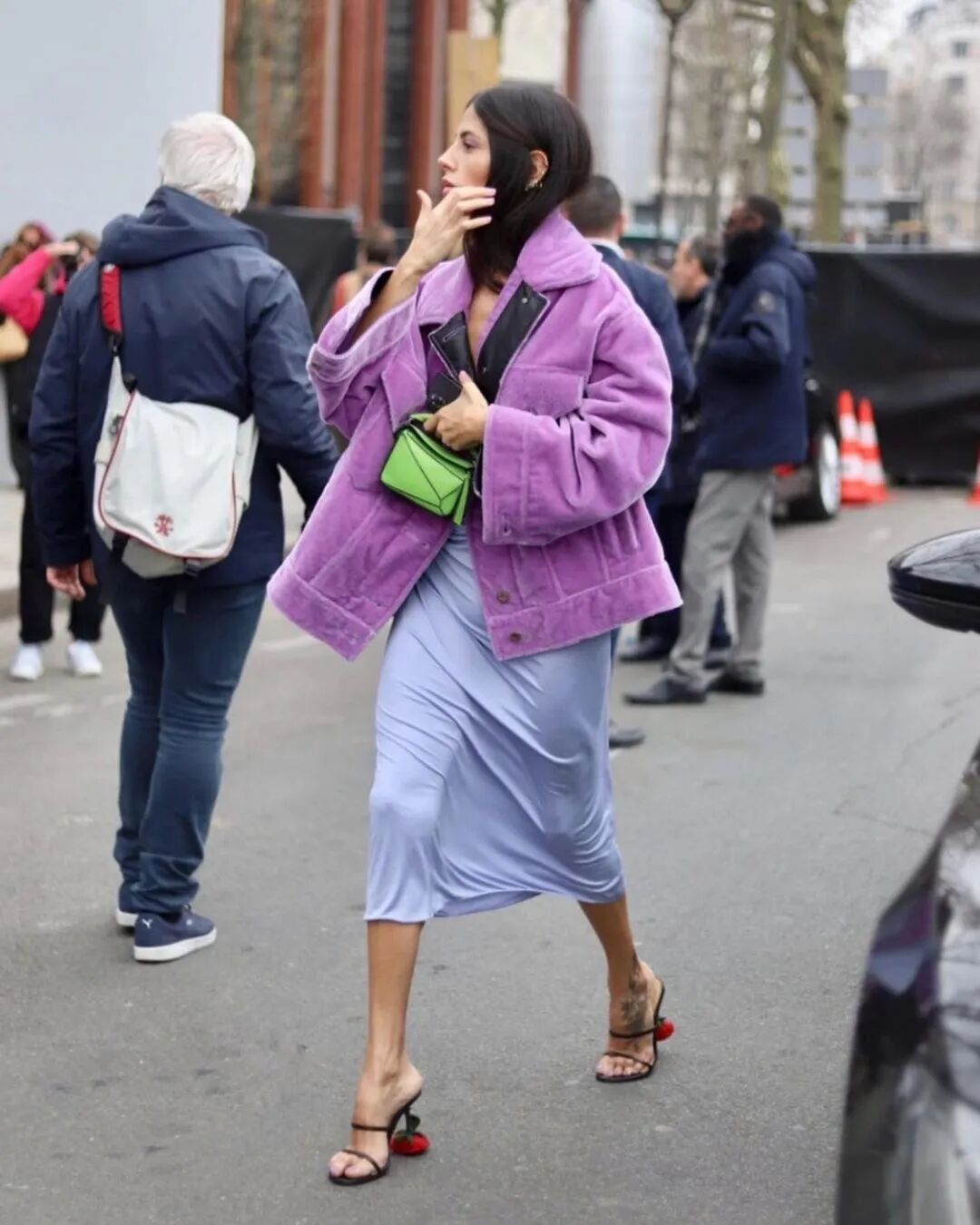 一般人都不敢想的“死亡色”芭比粉,還偏偏是成套的絲質裙, Diletta的膚色也不白,但注意白的反義詞不是蠟黃,她的膚色是意大利女人推崇的健康膚色。