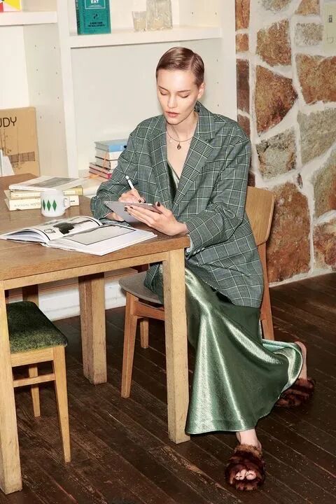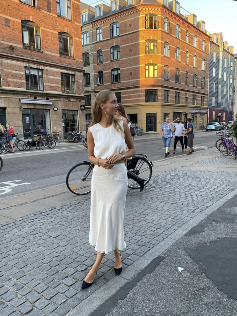 絲質裙特別的材質到了擅長用同色系塑造層次感的北歐女人手中,會有用針織、棉質、薄紗,同樣一件絲質裙物盡其用。