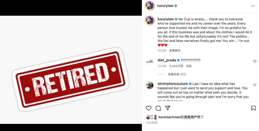 “My Cup is empty…..感謝多年來支持我和我事業的所有人。每個信任我的人都把他們的形象交給我,我非常感謝你們。如果這個行業只是關於衣服,我會在我的餘生中一直做下去,但不幸的是,它不是!政治、謊言和虛假敘事終於讓我明白!你們贏了……我退出。”