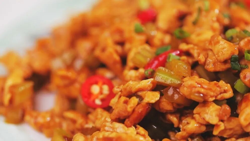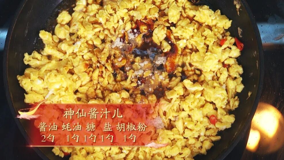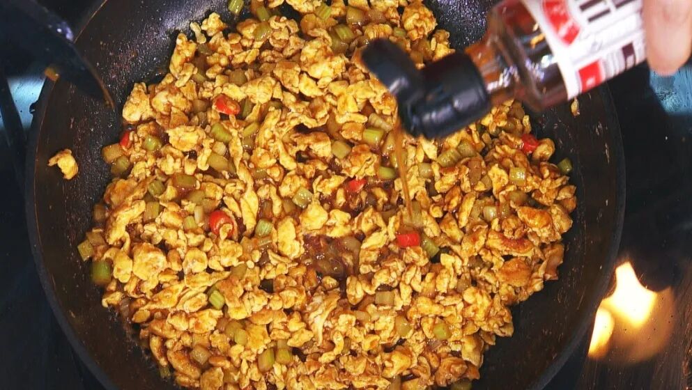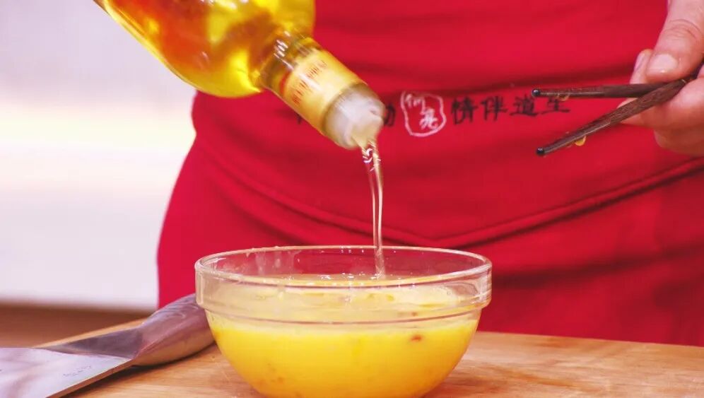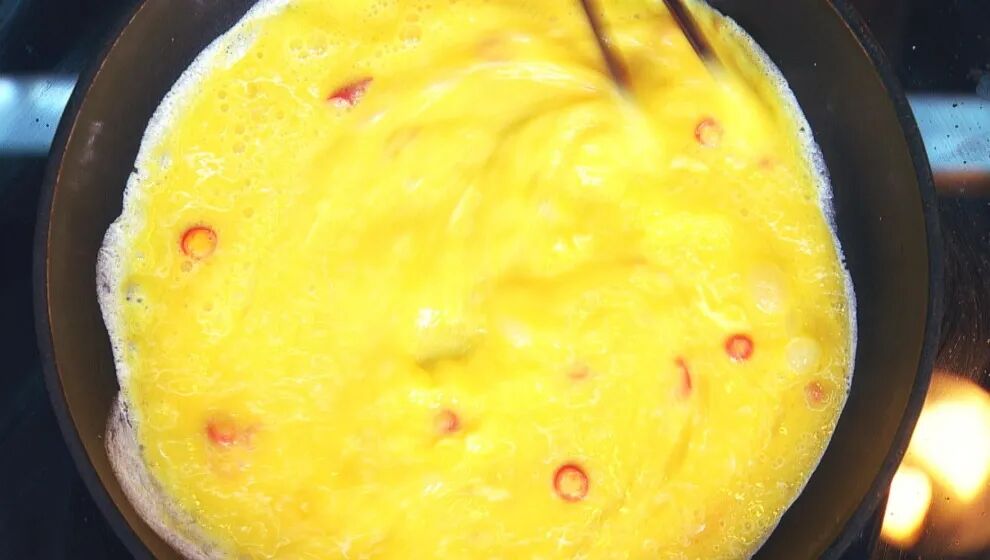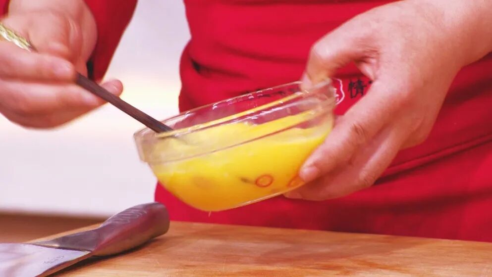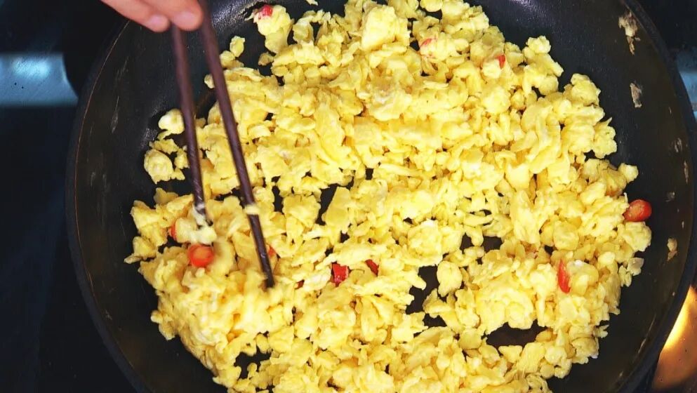 雞蛋加入薑末、小米辣打散,倒入少量油調勻,小火下鍋不斷攪散。