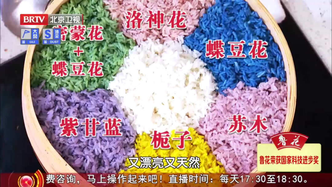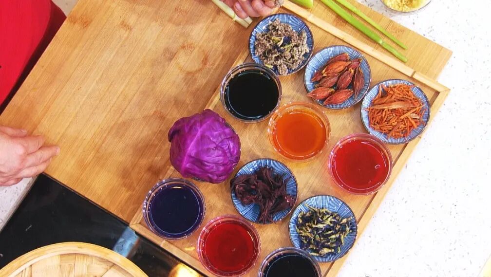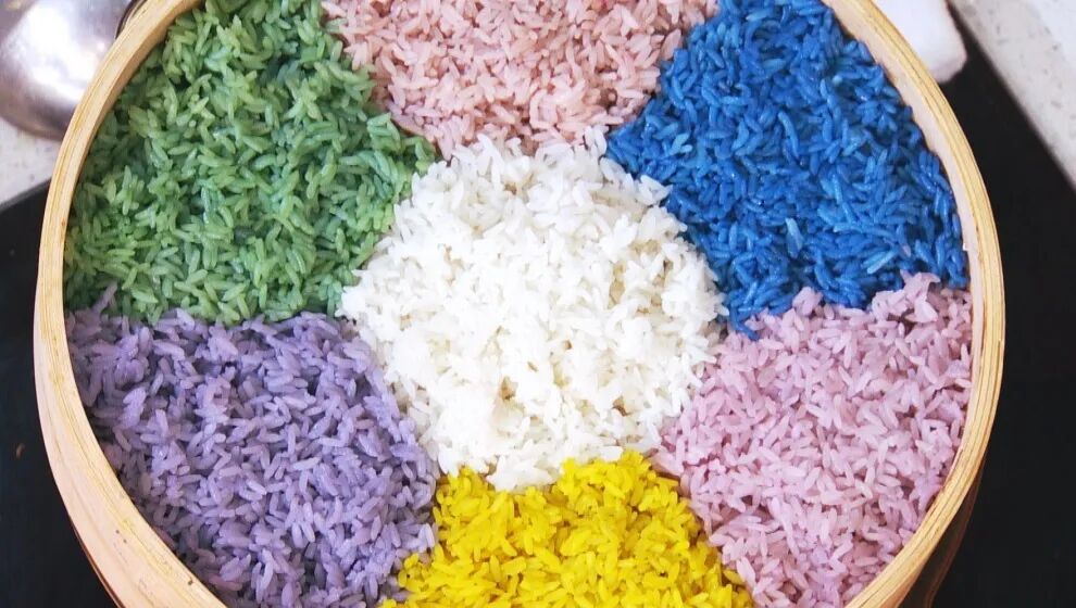大米淘洗乾淨後,用“天然著色劑”(蝶豆花、密蒙花、梔子、紫甘藍、蘇木、洛神花等)泡出的水浸泡2小時上鍋蒸熟。