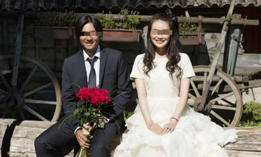 他們的婚禮沒有鑽戒、也沒有婚宴,婚紗是品牌之前送的,頭紗、西裝和裙子是街邊買的。除此之外,只有一把玫瑰。