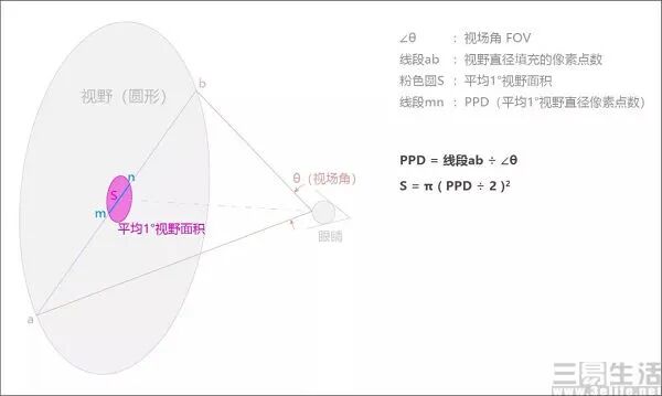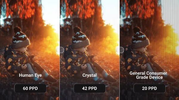 因此業界引入了PPD( 角分辨率)這個概念,指的是視場角中平均每1° 夾角內填充像素點的數量。人眼正常視力下的分辨能力為60PPD,即VR頭顯越接近60PPD,成像清晰度就越接近人眼看到的正常世界。沒錯,在VR頭顯領域,物理分辨率並不是決定清晰度的唯一指標。