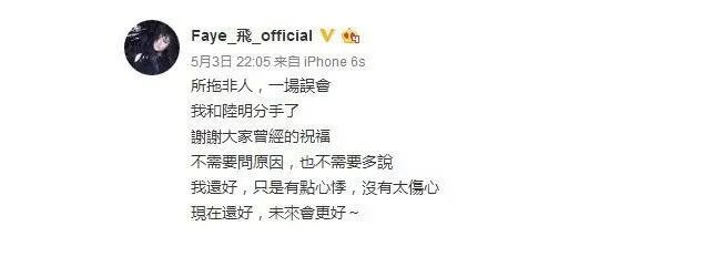 然而這份感情對於詹雯婷來說,來得太快,失去得也快。5月3日,詹雯婷宣佈與陸明分手,並表示:所託非人,一場誤會。