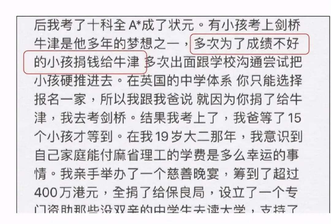 豪門捐錢學校送小孩讀書並不少見,何猷君在寫給父親的信裡說,何鴻燊為了成績不好的小孩捐錢給牛津,多次和學校溝通把小孩子硬推進去。