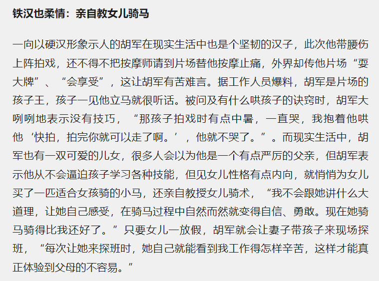 因為女兒九兒性格有點內向,胡軍就買了一匹適合女孩兒騎的小馬,親自教女兒騎馬,讓她在騎馬的過程中變得自信勇敢,後來女兒摔倒,他也不扶,一定要讓女兒克服恐懼。