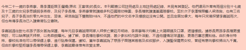 可因為早年李澤鉅曾經被綁架,李嘉誠要求讓保鏢陪伴孫子入學,結果學校以學生“一視同仁”為由拒絕,李嘉誠轉而讓李長禧在漢基國際學校讀書,上課時都有保鏢在一旁保護。
