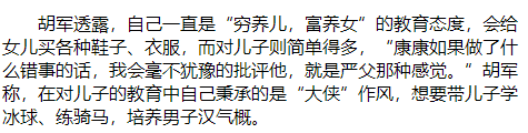 對兒子要窮養,對女兒要富養,胡軍會給女兒買各種鞋子、衣服,把她寵成小公主,但是,小公主也要學會騎馬。