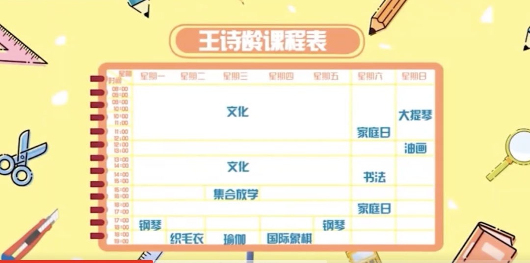實際上,王詩齡讀的學校課程超豐富,週一到五都有課,鋼琴、瑜伽、國際象棋……還有織毛衣這種小眾課,週日也沒閒著,要上大提琴課和學油畫。