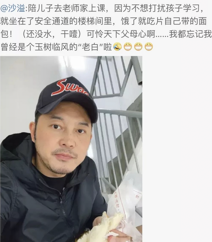 並且孩子上得累,家長也閒不了,想陪娃又不想打擾娃學習,沙溢只得在過道里啃麵包。