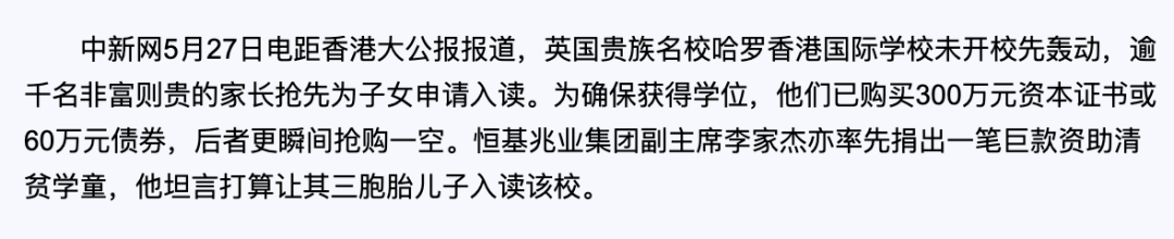 也就是說如果想要讀香港的國際學校,有錢人就先得購買學校的債券,孩子可能會獲得某些學校的優先面試權,當然這並不代表拿到offer。