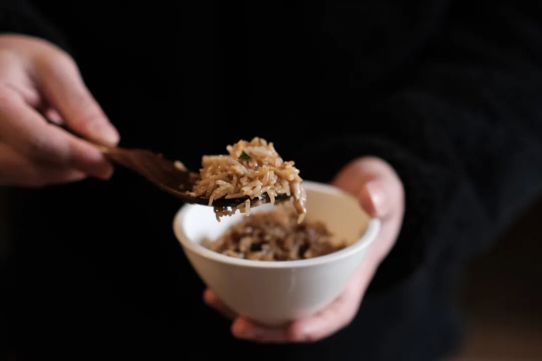 Step3.倒入筍、姬松茸片翻炒,加入泡好瀝乾的泰國香米;
