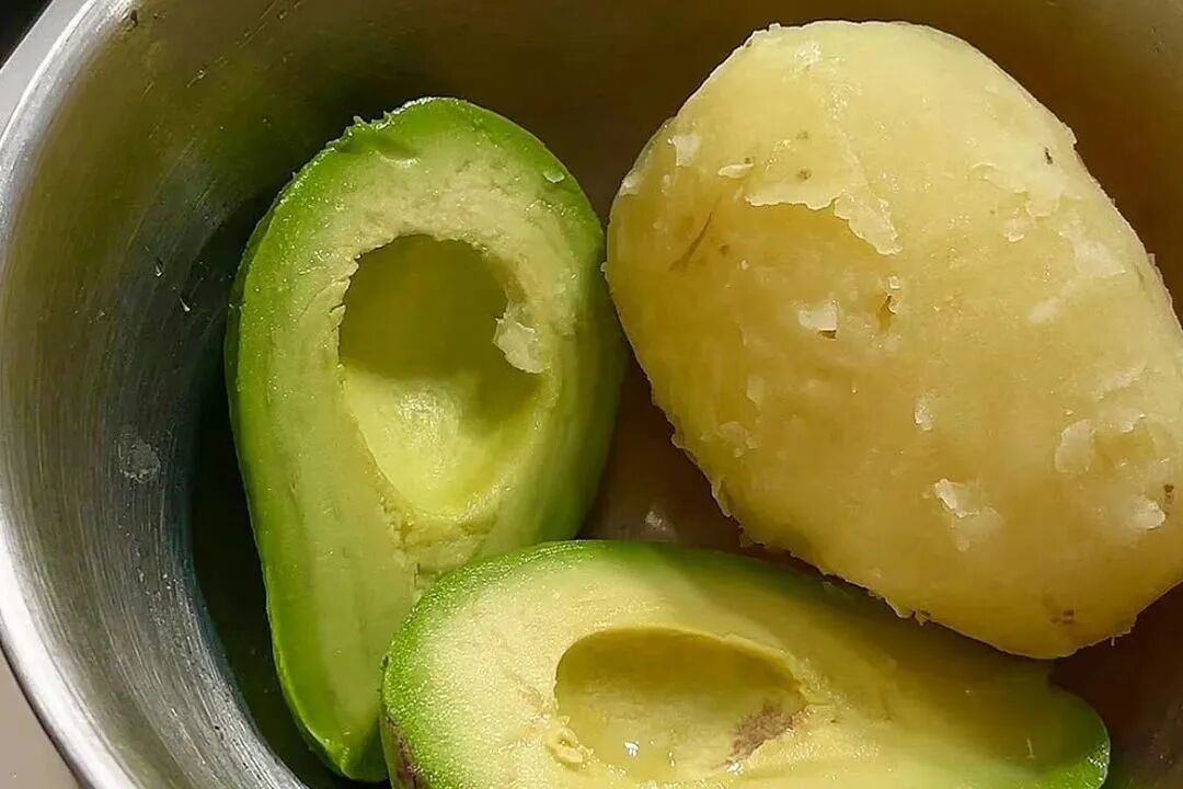 Step1.牛油果、土豆搗成泥,加入一把碎生菜;