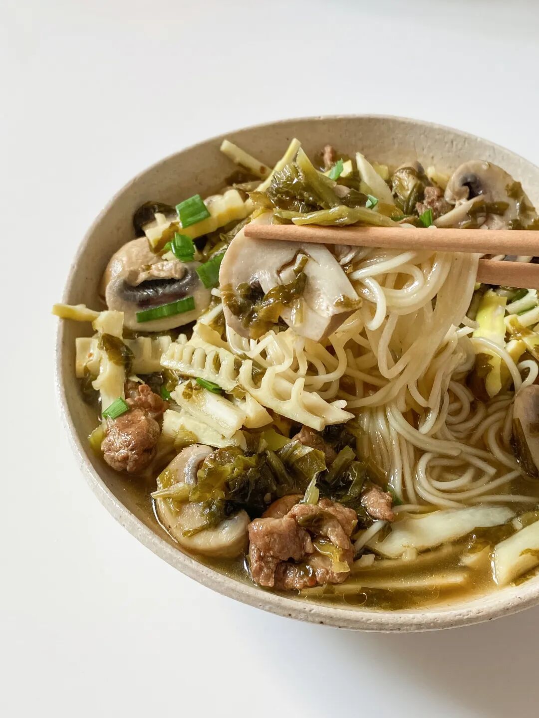 “我認為下班後如果感覺特別累的話,麵條是一個簡單高效的選擇。但只是清湯素面就覺得‘沒意思’、‘沒奔頭’、‘我上班都這麼累了為什麼不能吃點好的’,所以此時我一般會在澆頭上下功夫。春天裡豐富的食材給了我這些嘴饞思想更多的可趁之機,所以今天想要分享的春菜食譜是雪筍蘑菇肉絲麵,鮮上加鮮~”