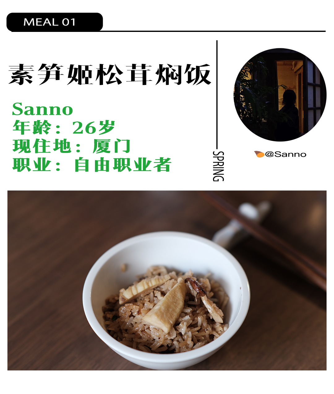 記得小時候,春分前後的春筍是家裡餐桌上一道必吃的食材。因為四川靠山吃山的地理條件,所以家四周的後山上都會有一片又一片的小竹林。春天可以和家人、小夥伴們一起在山上挖到好吃的筍。今年春分,Sanno 再次做了愛吃的“素筍姬松茸燜飯”。