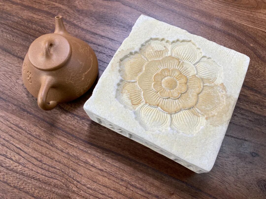 泡完的茶壺、茶杯放在上面,可以瞬間吸水,自然揮水不會有水漬漏到桌面上。就算茶水漏到茶臺上,花朵圖案沾了茶色,也別有韻味