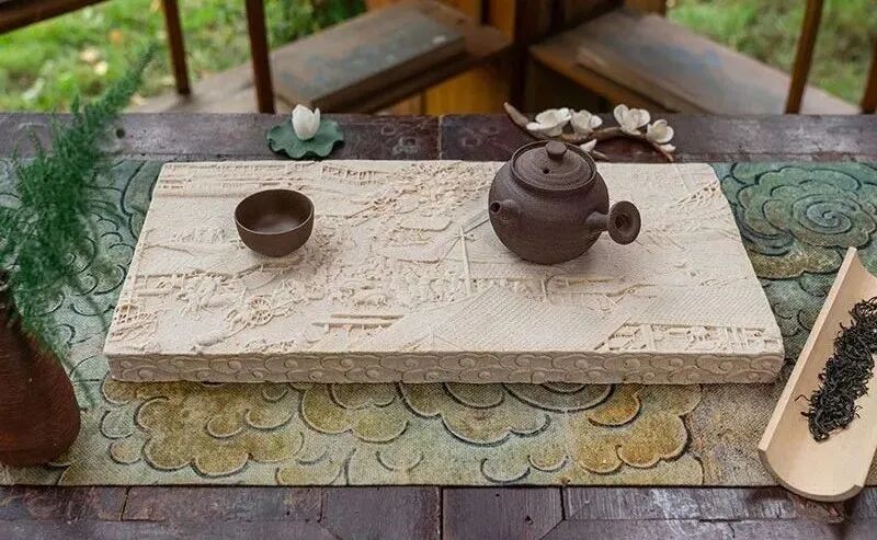 茶承浮雕選取《清明上河圖》名場面,在茶席上再現名畫風雅