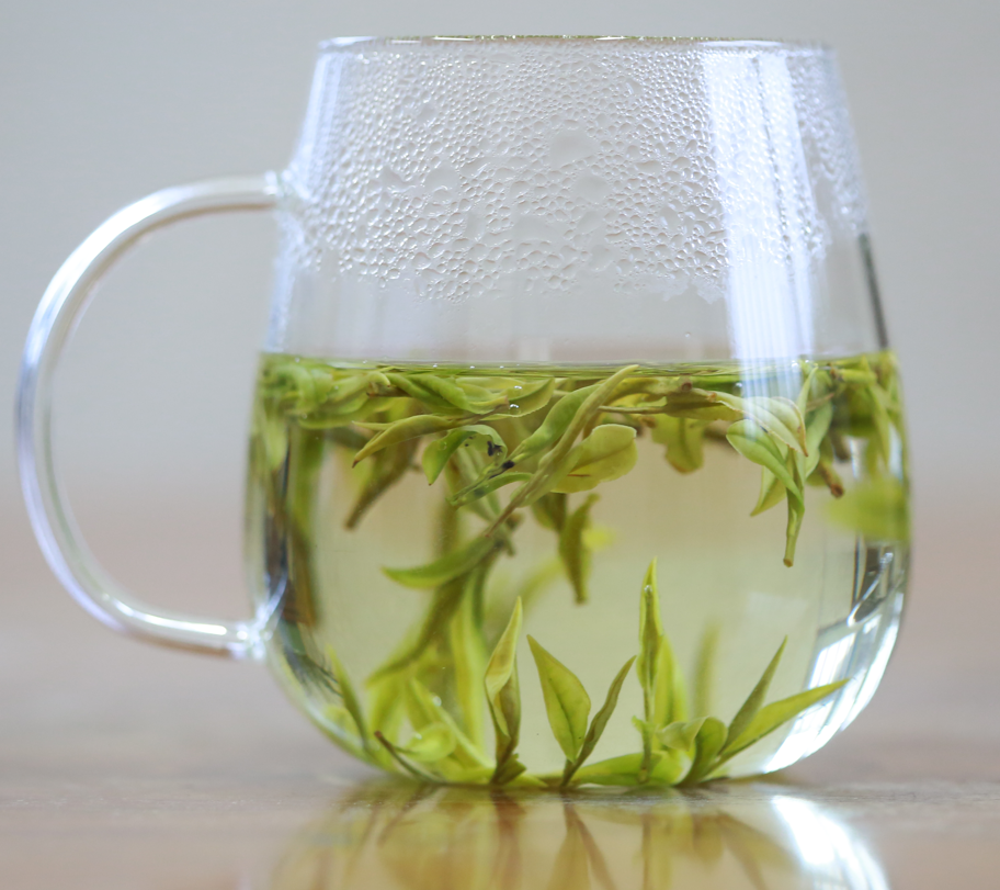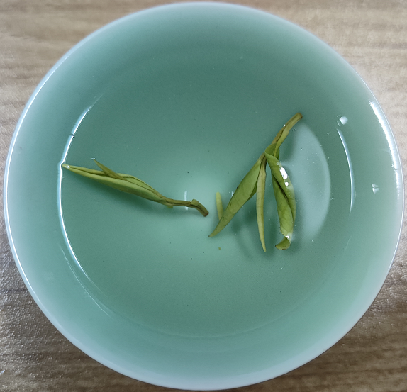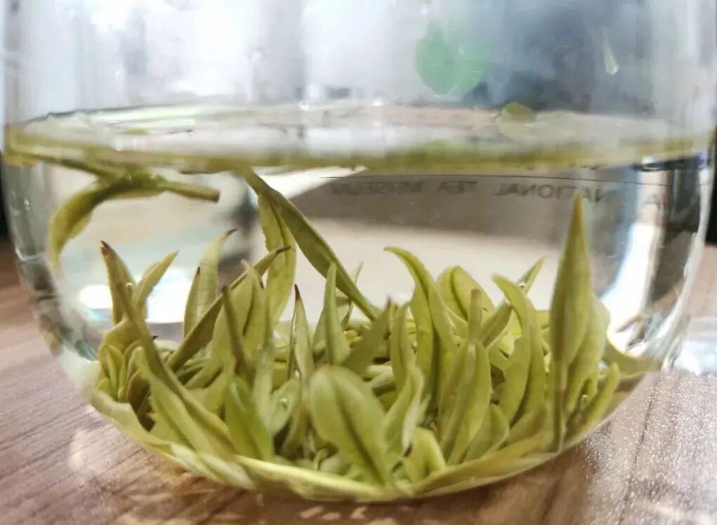 1.取玻璃杯,水開後涼至90度左右,注入7分,取茶上投,細嫩的芽葉慢慢舒展下落,葉白脈翠的嫩芽以不同的姿態躺在杯底,很好看。