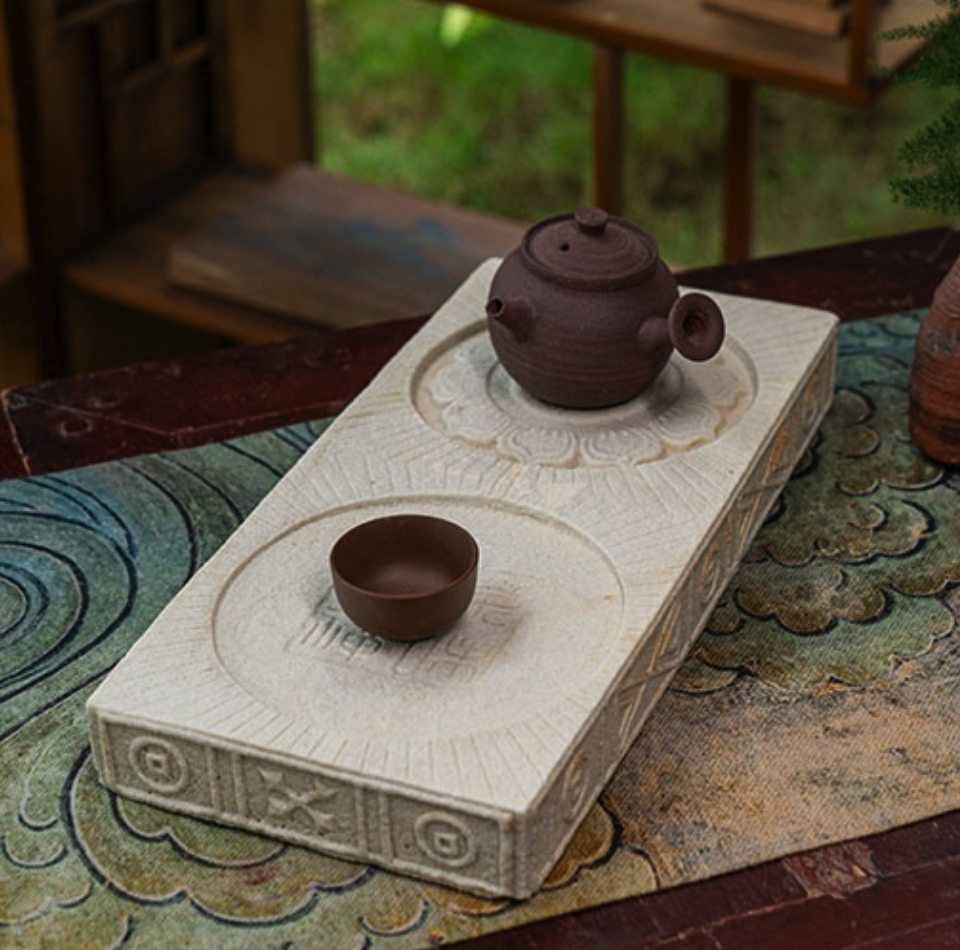 這款茶盤,以蓮花寶座和祥雲為依託,承壺承杯,寓意高貴吉祥