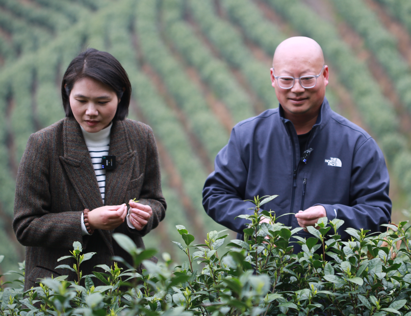 ▲老李的女兒李丹帶著方哥來茶山,查看今年白茶的長勢