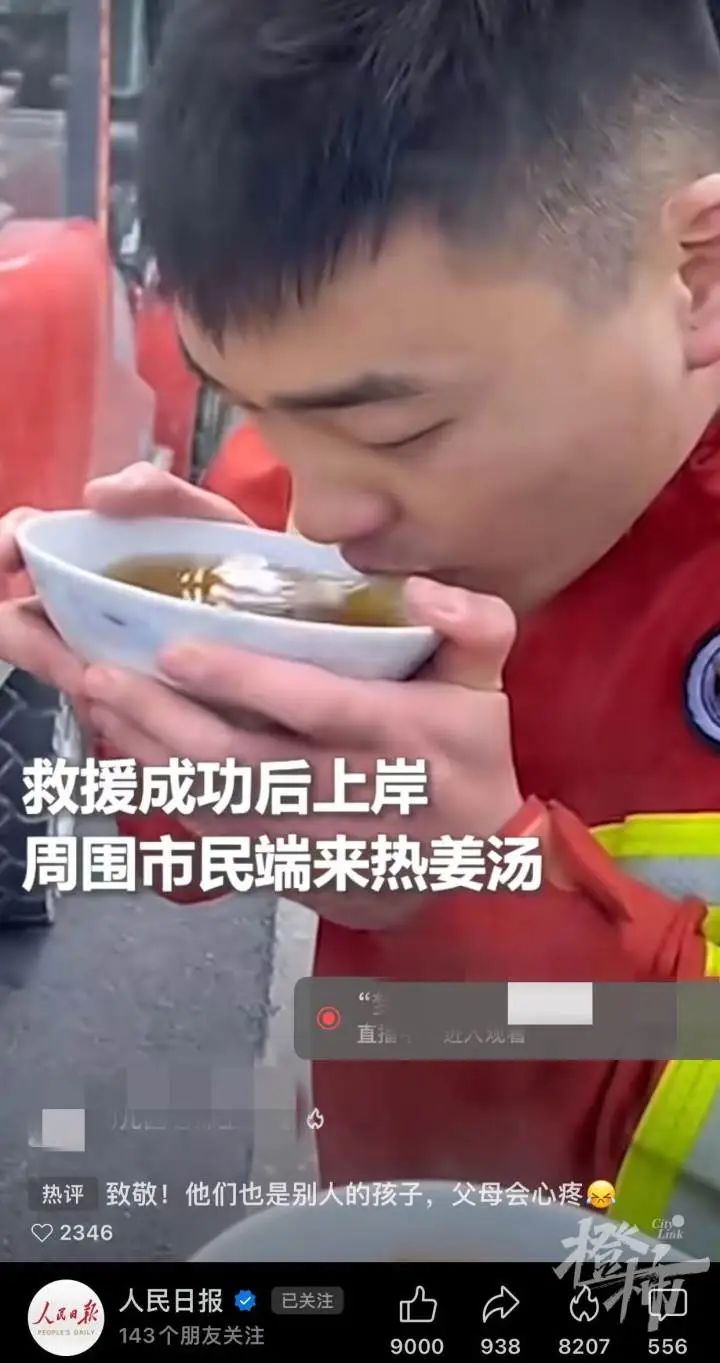 很多網友注意到,當時消防員上岸後,手捧著薑湯不停發抖,有網友說,河水實在太冷了,消防員很辛苦。