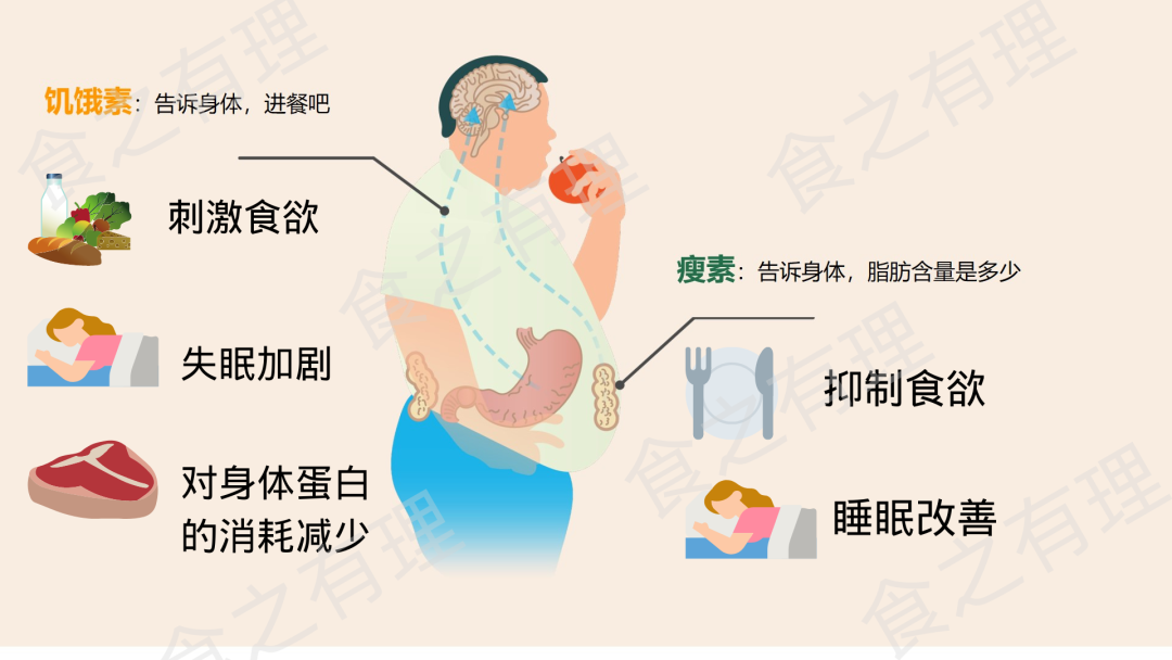 一旦身體發覺脂肪含量正在下降,瘦素水平就會下降,飢餓感增加,食慾就開始增加,基礎代謝也會下降;與之相對另一種激素,胃飢餓素正好啟動分泌,讓你食慾增加,夜裡餓的輾轉反側。