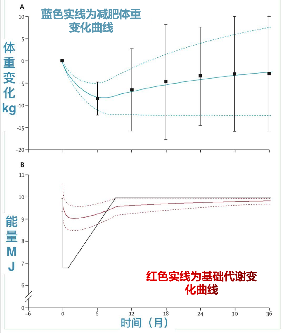 來自柳葉刀雜誌,減重後的體重變化曲線與基礎代謝曲線變化相關性研究:發現在前6個月體重快速下降時候,基礎代謝消耗也隨之快速下降以適應人體變化。