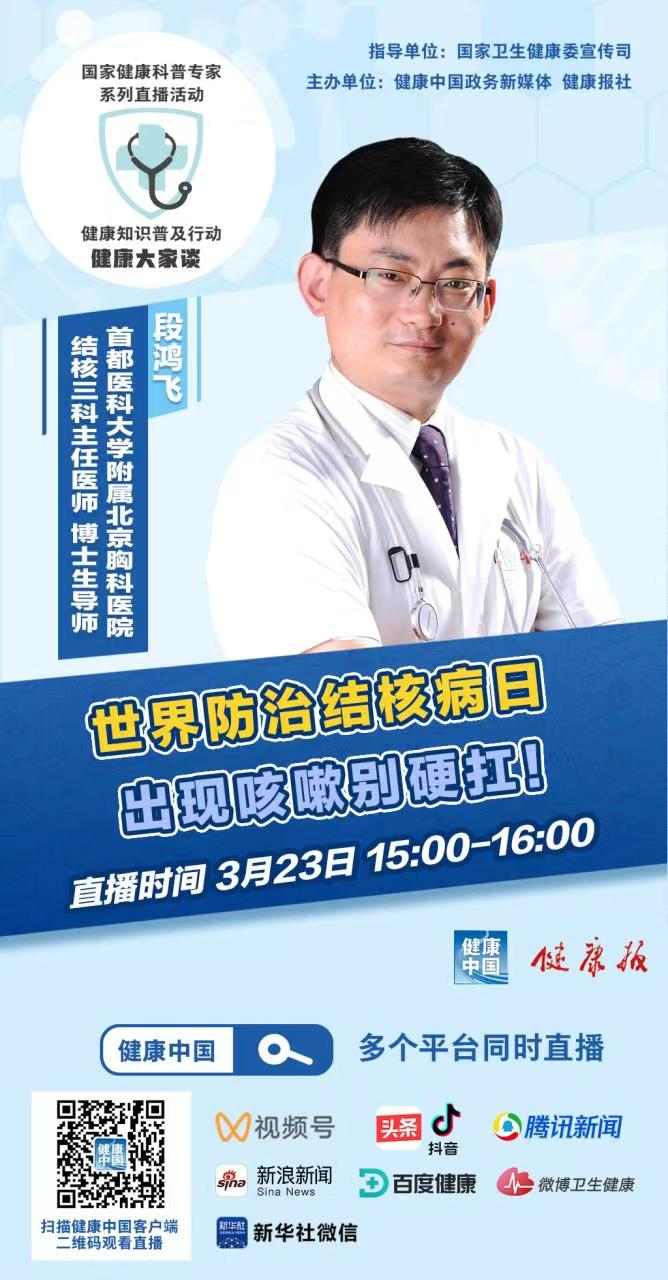 本期【健康大家談】邀請首都醫科大學附屬北京胸科醫院結核三科主任、主任醫師、博士研究生導師段鴻飛,今天下午3點做客“健康大家談”直播間,給大家科普關於結核病預防等的相關知識。