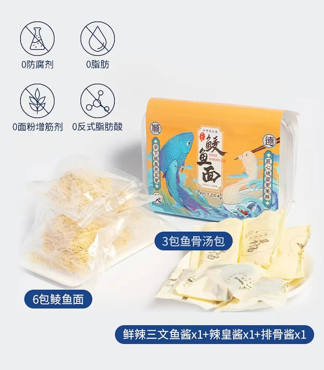 1盒鯪魚面配置:6捆面(獨立包裝)、3包醬、3包鮮魚湯;