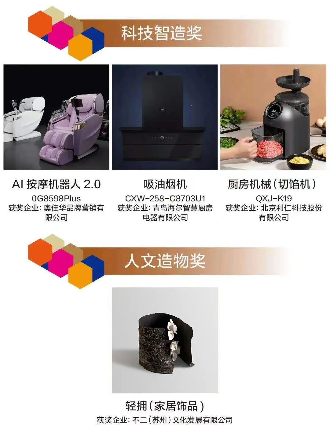 經過作品徵集、初審、專家評審等程序,共有近20家企業的參賽產品從眾多時尚優質、創意智能的產品中脫穎而出,榮獲綜合獎(金獎、銀獎、銅獎)和八類單項獎(色彩美學、創意設計、創新材質、低碳先鋒、健康風尚、科技智造、人文造物、Z世代悠生活)。在本次大會現場舉行了頒獎儀式,成為家居產業時尚發展大會精彩的一環!
